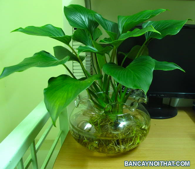 Hình thái: Cây để bàn phong thủy này có lá hình trái tim có màu xanh bóng đậm, cây có dạng tán tỏa tròn và có bộ rễ trắng ấn tượng đâm tua tủa trong làn nước góp phần làm tươi mát cho văn phòng của bạn.